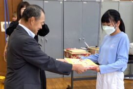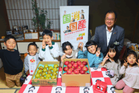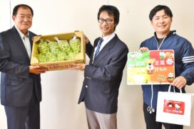 シャインマスカット(3房)とランチョンマット(Aタイプ・Bタイプ各10枚)を贈呈しました。