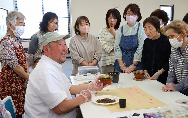 参加者は、三浦さんにコツを教わりながら、色合いやバランスを考えながら鉢に10種類以上の多肉植物を植え付け、寄せ植えを仕上げました。