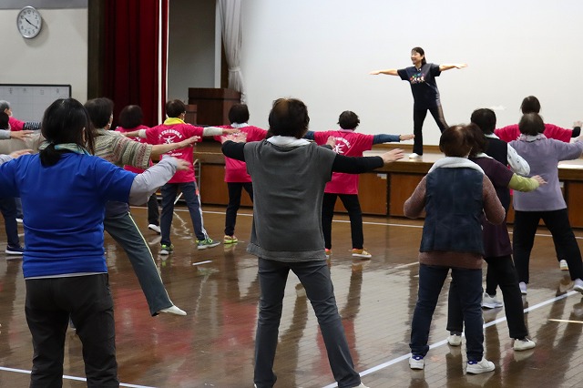 このほか、音楽に合わせたダンスや、タオルを使った有酸素運動で楽しく体を動かし、運動後にはストレッチで全身をゆっくりとほぐしました。