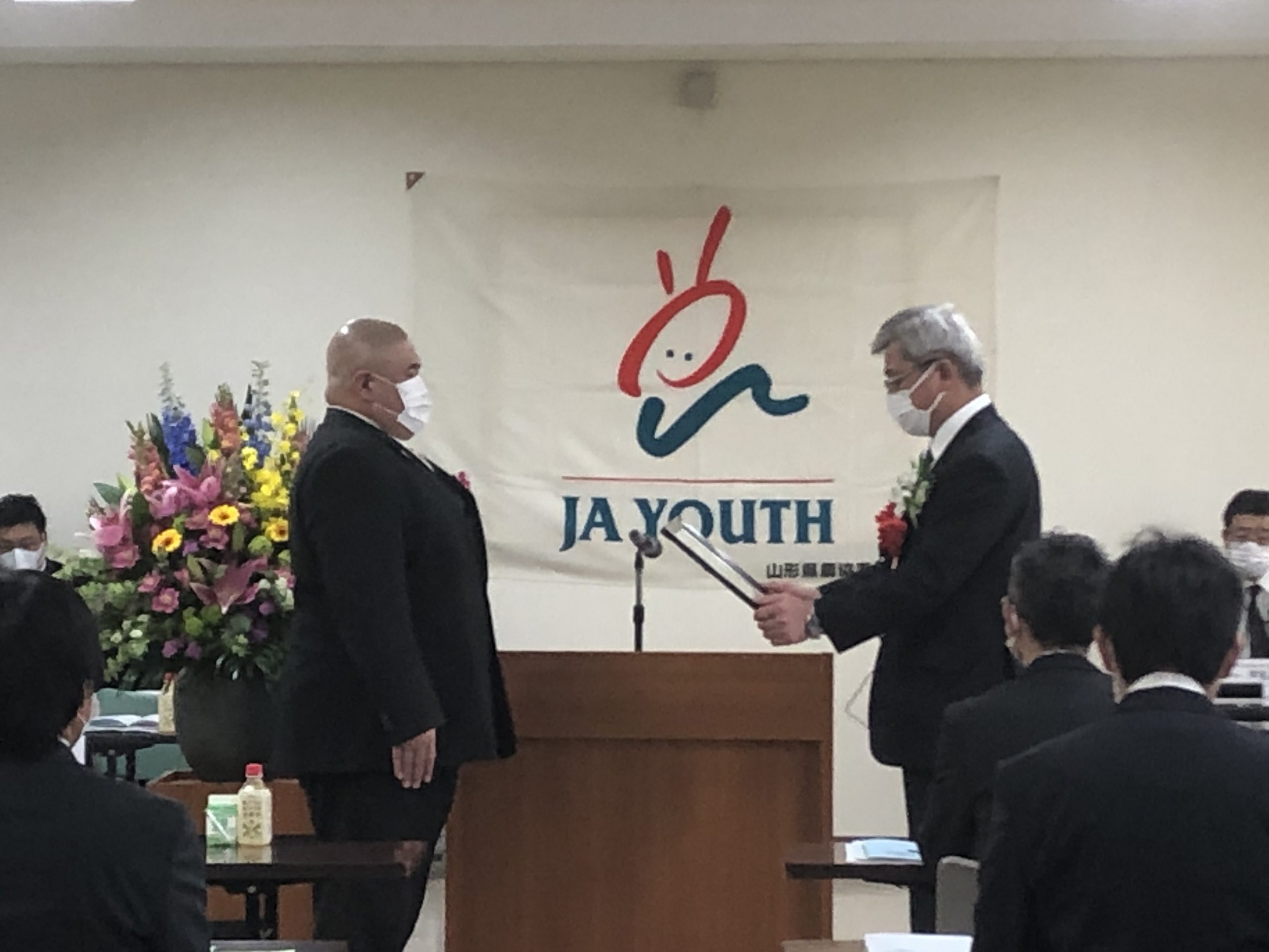 また、2期2年にわたり県青協会長としてご尽力いただいた小南会長が、中央会功労者として表彰され、JA山形中央会折原副会長から表彰状が手渡されました。