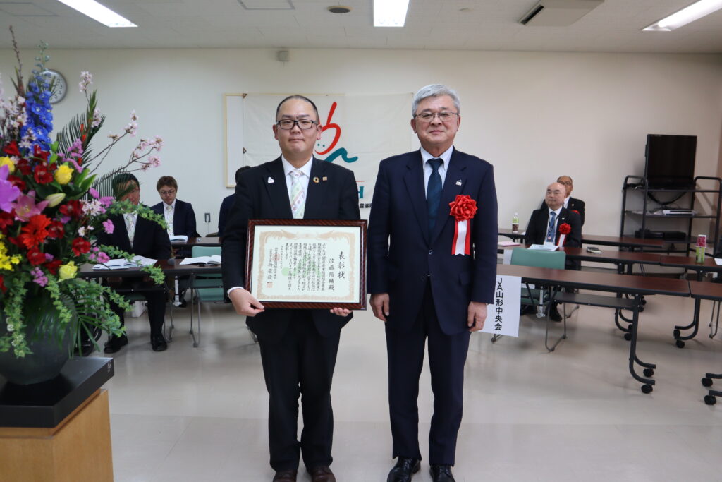また、総会最後には令和4年度~5年度会長を務めたJA庄内たがわ 佐藤 陽輔 氏へJA山形中央会より功労者表彰が行われました。