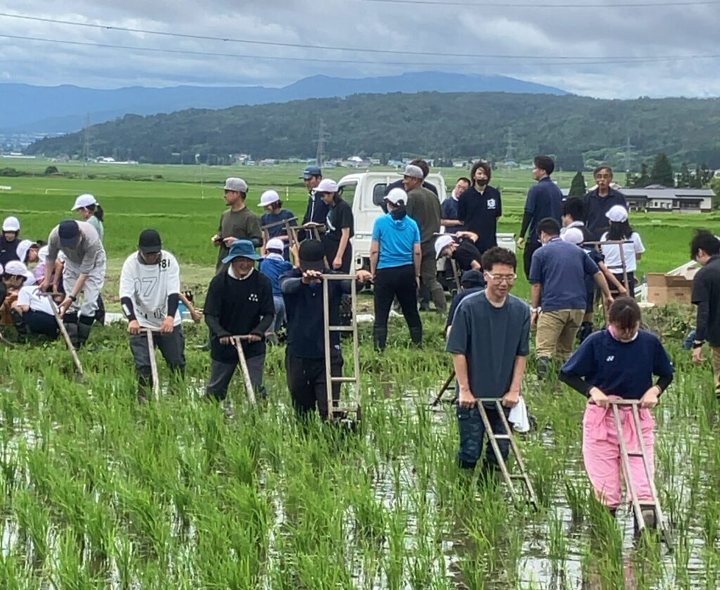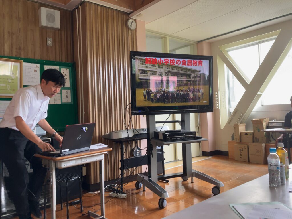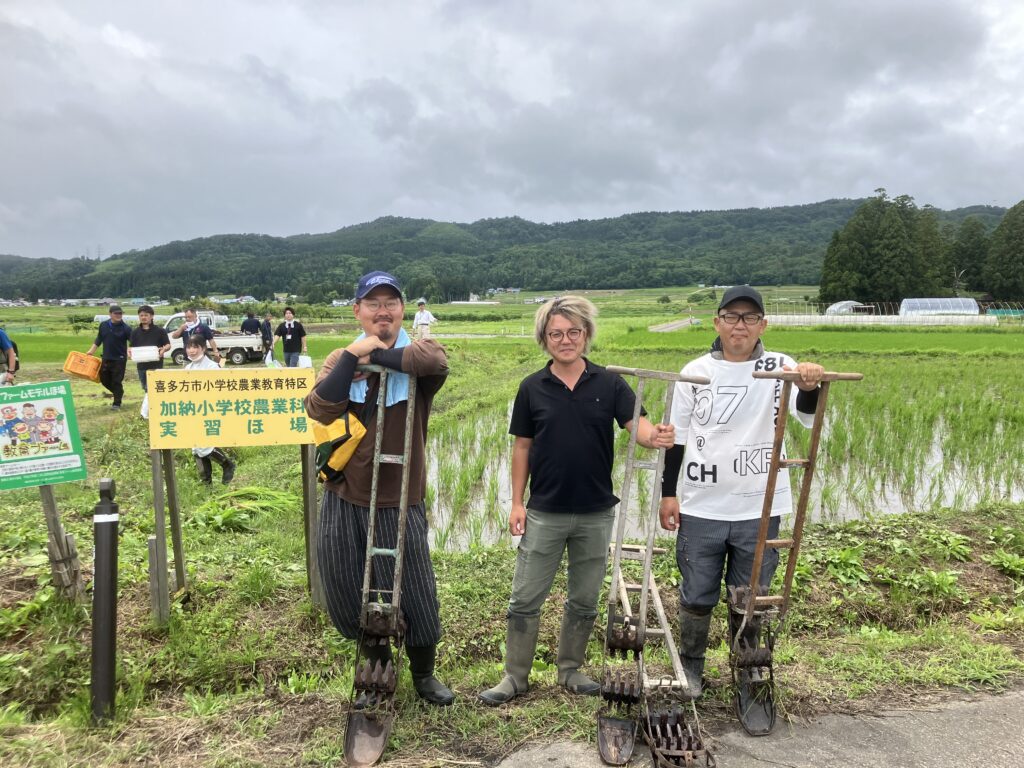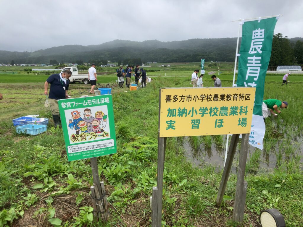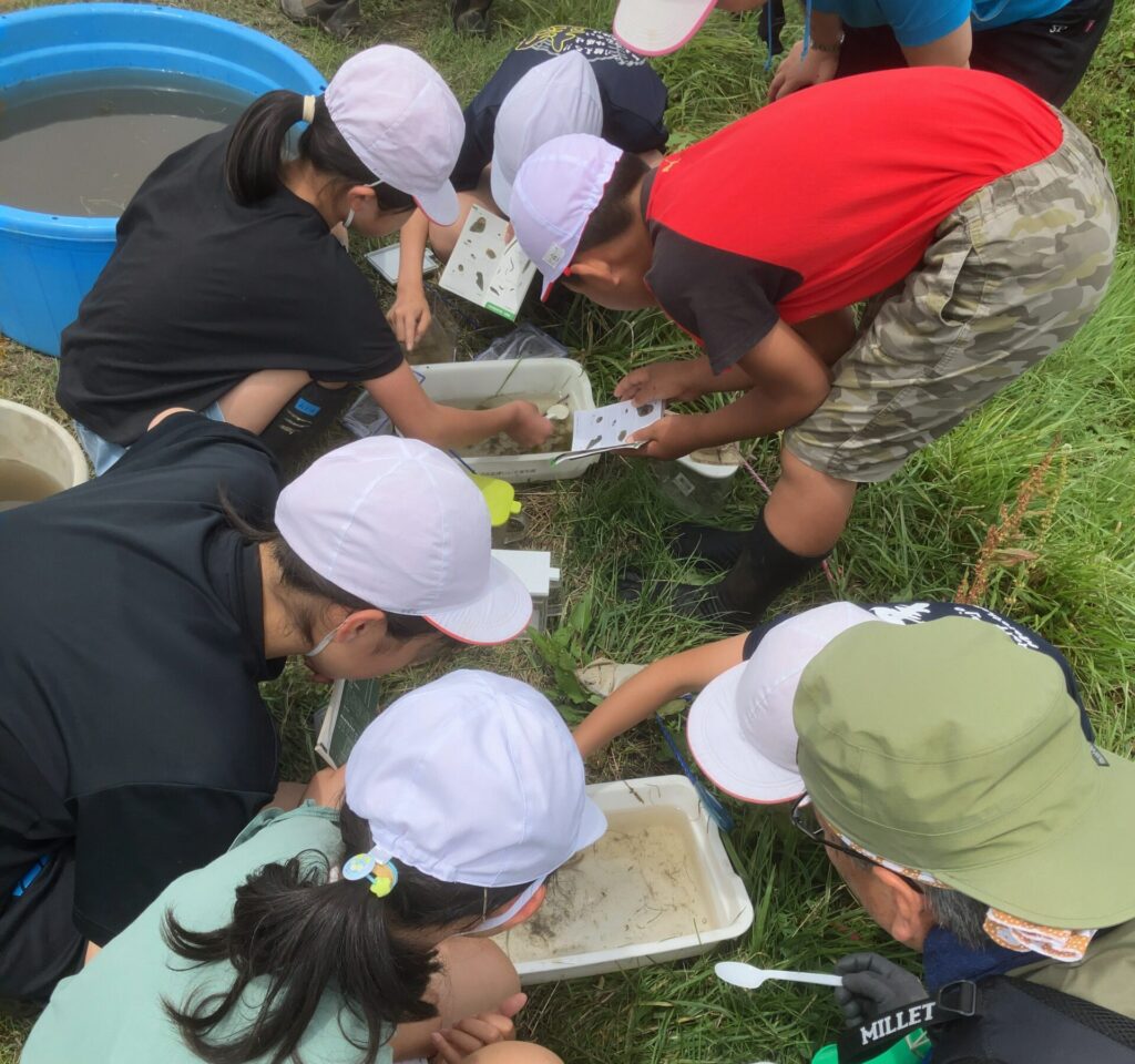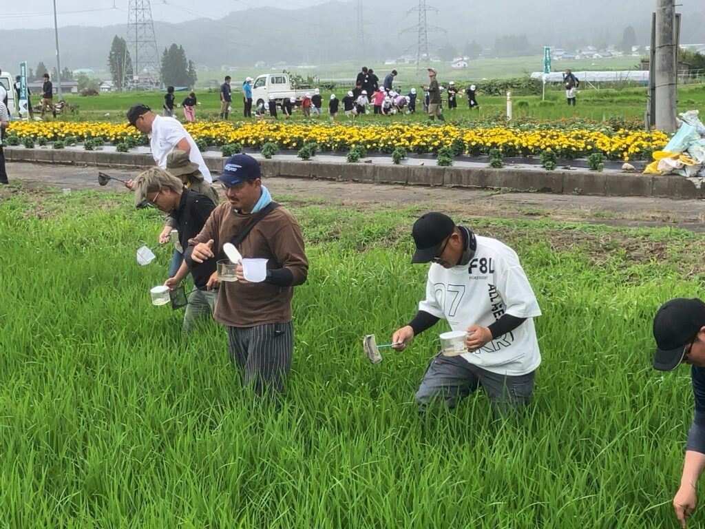 本研修会では、喜多方市立加納小学校の農業科授業を見学し、田んぼの生きもの調査と田んぼの除草作業を小学生と一緒に実施しました。その後、加納小学校の食農教育活動や学校給食の取り組みについて、関係者から話を伺いました。