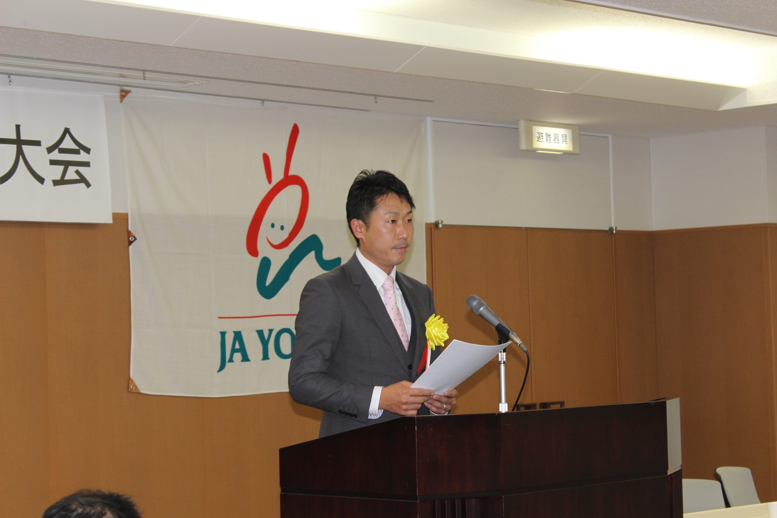 ↑青年の主張発表最優秀賞に輝いたJA山形おきたま白鷹地区青年部 鮎貝支部の横山聡さん